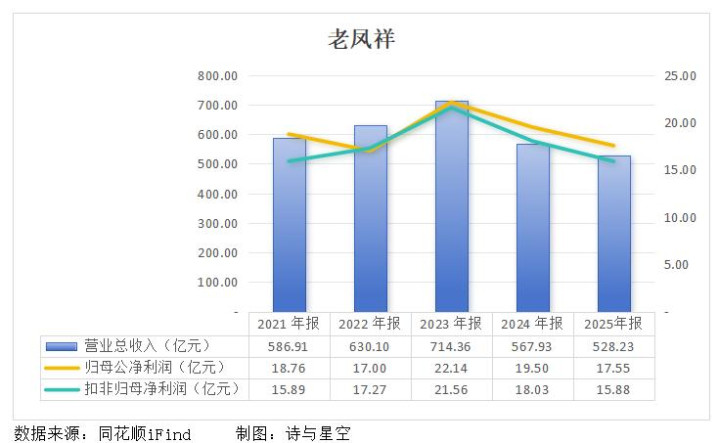 2025年,老凤祥全年完毕生意收入528.23亿元,同比下跌6.99%;包摄于上市公司鼓励的净利润为17.55亿元,同比下跌9.99%;扣除非不时性损益后的净利润降幅更是扩大至11.92%。