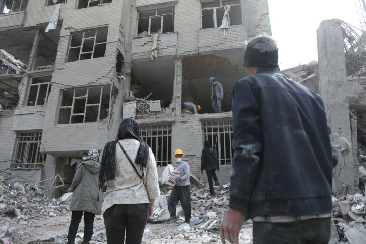 3月12日,在伊朗王人门德黑兰,市民从损毁的建筑里搜寻生存用品。