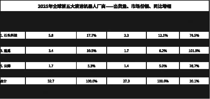 清洁机器东说念主赛说念,早已不是一家独大的时局。IDC数据骄矜,2025年石头科技以580台位居第一,科沃斯以470万台屈居第二,追觅、小米、云鲸紧随自后。前五名均被中国厂商包揽,且差距正在松开,竞争维度执续升级。