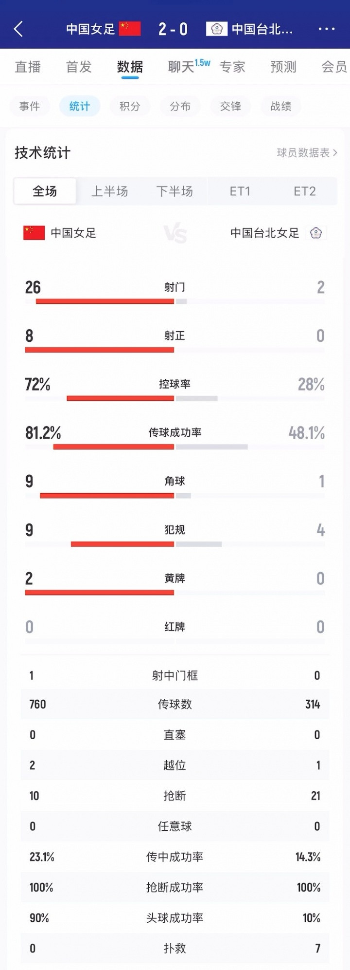 > 凤凰彩票首页 占尽上风! 全场数据: 中国女足狂轰26射! 控球率超7成, 被射正0