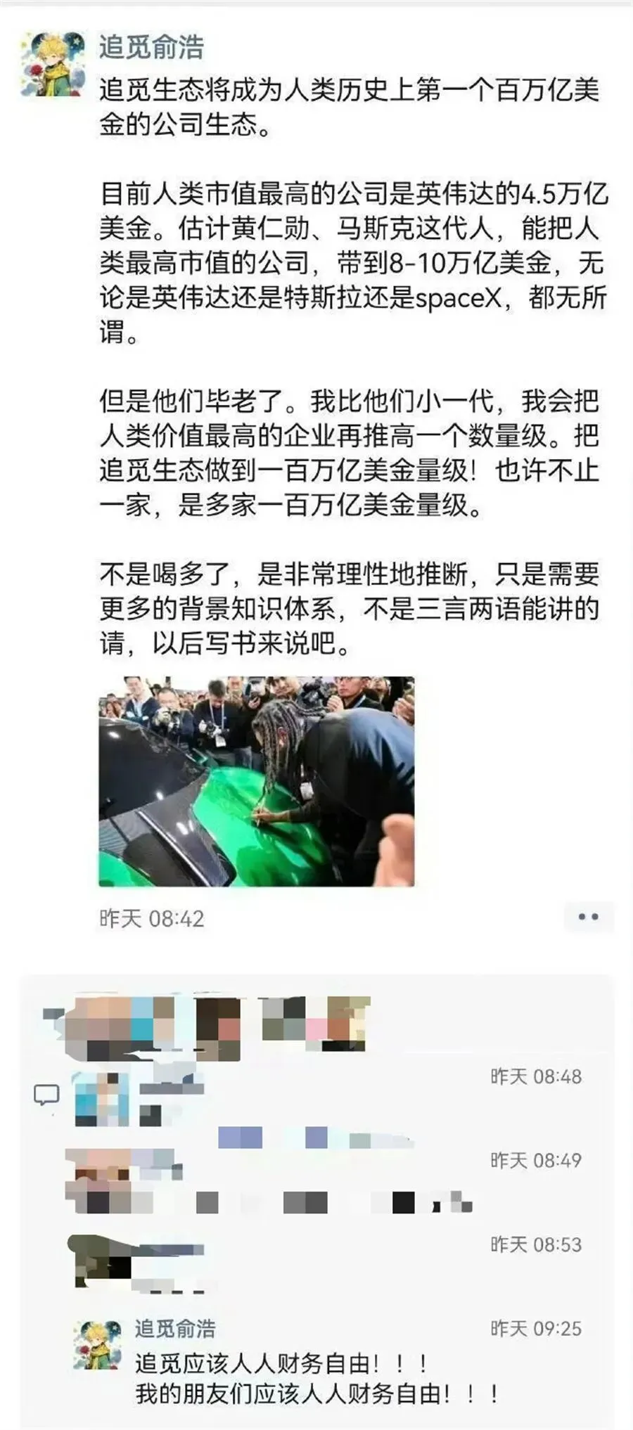 反驳的本体主要针对此前网传俞浩一又友圈的截图,其声称“追觅生态将成为东说念主类历史上第一个百万亿好意思金的公司生态”,该职工直斥“药嗑多了?一年卓著英伟达,一年卓著中国悉数车企30年未达见效果?”,并机敏驳诘公司高层是否了解好意思划定律。